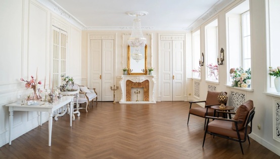 Зал Мишель в студии BestMemories — это пространство, где сочетаются дворцовая эстетика и современная функциональность. Интерьер с лепниной, зеркалами и камином и белая циклорама открывает возможности для различных съемок.