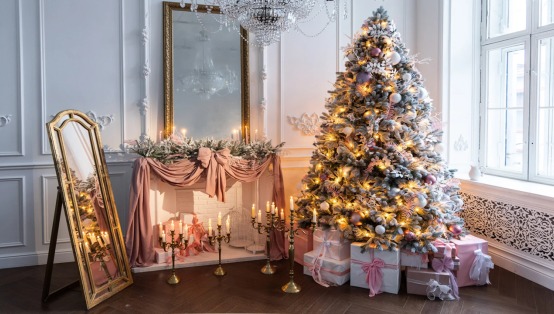 Элегантная ёлка в нежных пастельных оттенках и интерьер в духе классического дворца превратит Вашу съёмку в кадры из рождественского фильма.