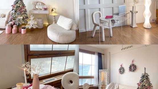 В зале Cozy новогодний декор!) Заснеженная елка с розовыми украшениями и подарками! На стенках заснеженные венки с розовыми бантиками!