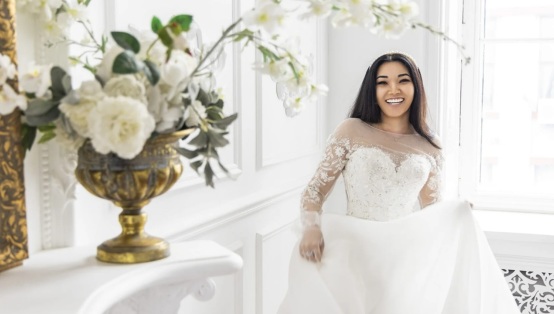 Зал “Honey” — простор с чёрной циклорамой и регулируемым светом. Это выбор для тех, кто хочет добавить съёмке контраста и глубины. На фоне лаконичного минимализма особенно выразительно смотрятся белое платье невесты, цветы и блеск аксессуаров.