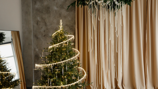 Во втором зале украшенную игрушками и огоньками ёлку укутает «парящая» спираль гирлянды 💫 Серая стена полностью спрячется за белым текстилем (декорация мобильная), а возле неё вы увидите подвесную композицию из хвои и жемчуга 🥰