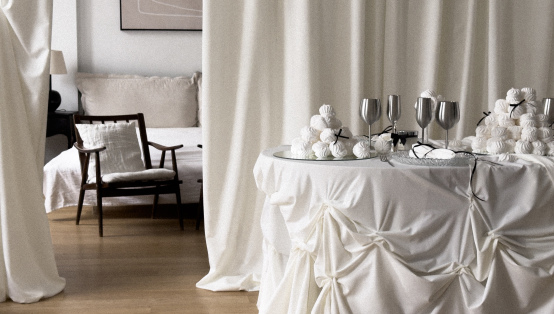 Мерцающая ёлка под лёгкой вуалью создаёт ощущение волшебства, а нежные драпировки наполняют пространство уютом 🤍.