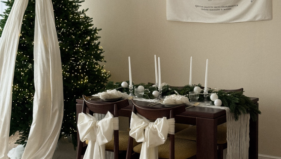 Воздушная ель с огромным белым бантом, элегантная сервировка, мягкие ткани и лёгкое сияние гирлянд создают атмосферу нежного зимнего утра. Идеальный интерьер для семейных, романтических и минималистичных контент-съёмок.
