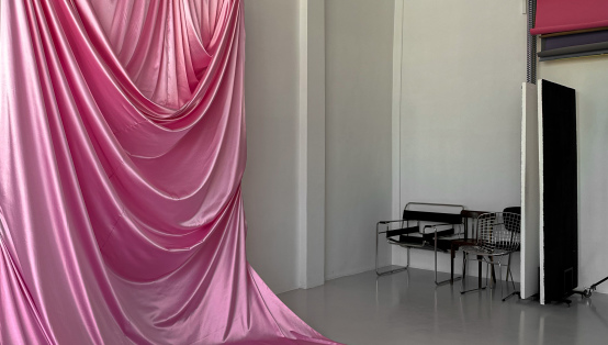 Струящаяся розовая атласная ткань добавит кадрам глубины, нежности и ощущение невесомости. Идеально для портретов и будуарных съемок.