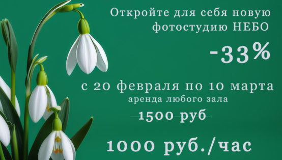 А чтобы это было ещё и выгодно, мы запустили весеннюю акцию с 20 февраля по 10 марта - аренда любого зала 1000 руб.