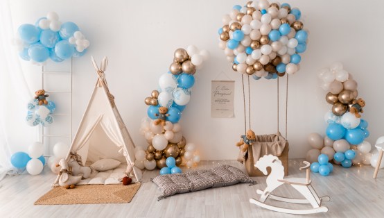 предоставляются. Есть настольные кубики, на которых вы можете поставить возраст вашего малыша, плакат и растяжка с днем рождения.