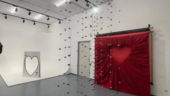 В студии есть белая циклорама 3×3 м, черный и красный бумажные фоны, два постоянных источника света с октобоксами (в комплекте есть соты), вентилятор для съёмок, штативы для телефона и штатив с кольцевой лампой.