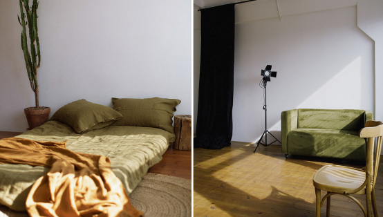• Белое + льняное (зелёное) постельное бельё, стёганое одеяло, подушки