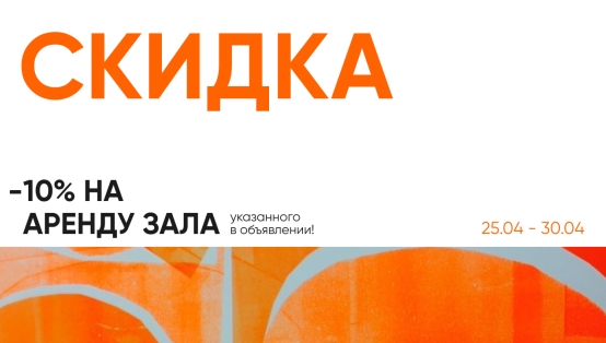 С 25.04 по 30.04 — скидка -10% на аренду любого из залов: Ринг, Марокко и Аппартаменты.