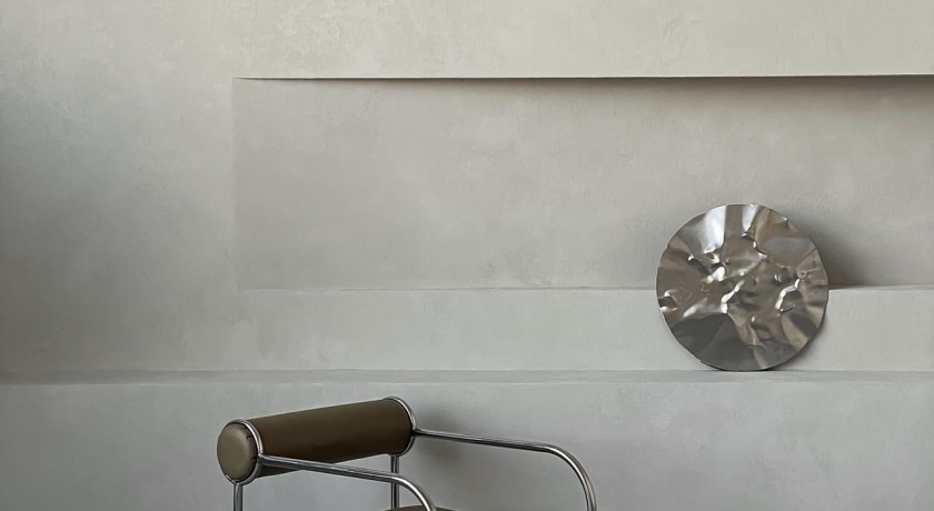 • Светлый, бежевый интерьер в стиле минимализм с элементами серебряного декора