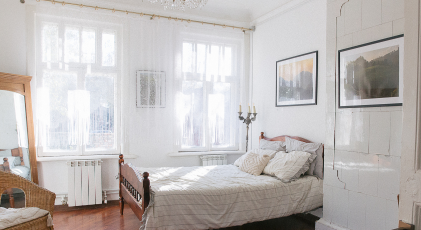 Уютный зал-спальня с большой винтажной кроватью, плетеной мебелью, старинным трюмо, большим зеркалом и роскошной печью.