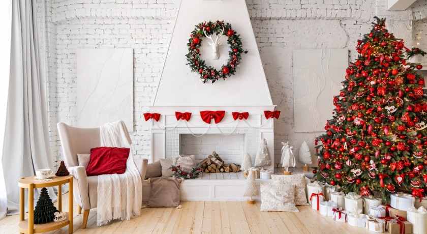 — искусственный камин с новогодним декором.