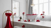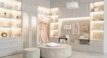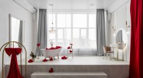 Shanti — настоящее воплощение уюта и гармонии. Он разделен на две зоны, каждая из которых наполнена уютом и атмосферой праздника. Первая зона — двуспальная кровать на подиуме с необычной формой зеркалом и туалетным столиком с новогодними декорациями, вторая — пышная елка с бежевым угловым диваном и по-новогоднему украшенным камином.