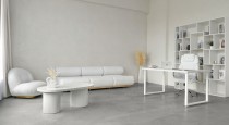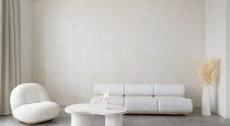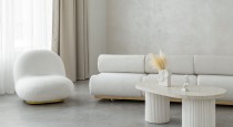 — угловой диван с каменным основанием и подушками льняного оттенка;