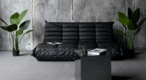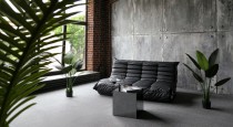 — черный кожаный диван с зеркальным журнальным столом на фоне растений и бетонной стены;