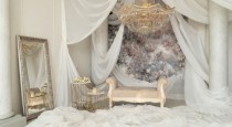 — белая софа с необычными люстрами;