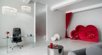 Зал умело поделен на две зоны: бежевую и белую. В бежевой зоне минимум предметов, необычных форм мебель и много воздуха. В белой зоне установлена циклорама.