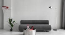 — серый диван необычной формы с металлическим торшером;