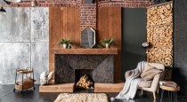— зона с большой елкой, винтажным креслом и паровым камином, встроенным в фактурную стену;
