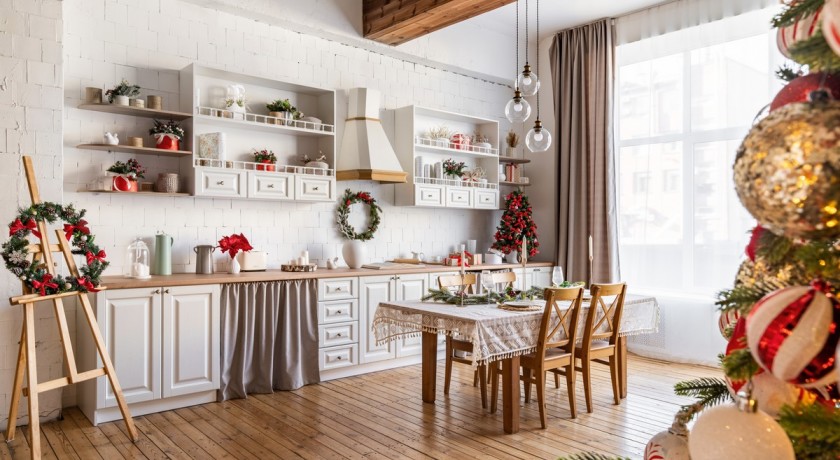 — светлая кухня в стиле прованса с новогодними декорациями;
