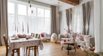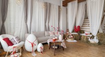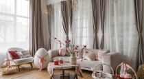 — зона со светлым диваном, журнальным и столиком в праздничном оформлении;