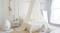 — светлых тонов кровать с балдахином, прикроватными тумбами и напольным зеркалом;