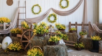 — светлая деревянная лестница с тюками сена и пасхальным декором;