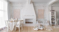 — зона с белым камином, обеденным круглым столом и пасхальными декорациями;