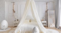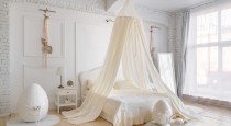 — светлых тонов кровать с балдахином, прикроватными тумбами и напольным зеркалом;