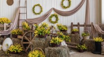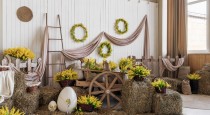 — светлая деревянная лестница с тюками сена и пасхальным декором;