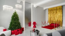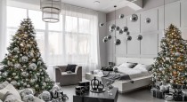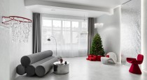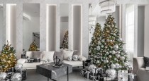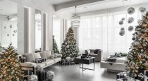— большая пышная елка с белым диваном и кубическим столом на фоне мраморной стены с зеркальными вставками;