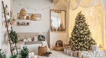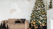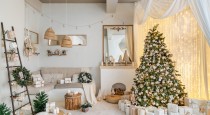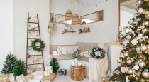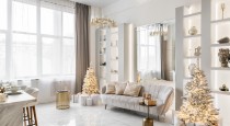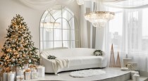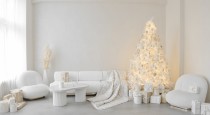 — зона с диваном и креслами в молочных оттенках и пышной елкой;