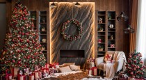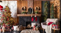 — камин с рождественскими композициями, креслом в стиле ретро и уютными пледами с подушками;