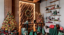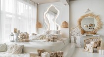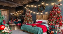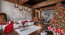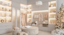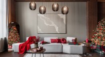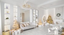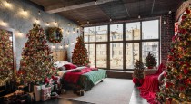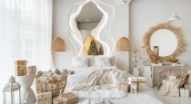 Shanti — настоящее воплощение уюта и гармонии. Он разделен на две зоны, каждая из которых наполнена уютом и атмосферой праздника. Первая зона — двуспальная кровать на подиуме с необычной формой зеркалом и туалетным столиком с новогодними декорациями, вторая — пышная елка с бежевым угловым диваном и по-новогоднему украшенным камином.