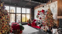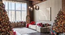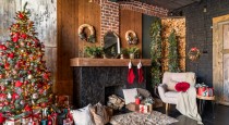 — зона с большой елкой, винтажным креслом и паровым камином, встроенным в фактурную стену;