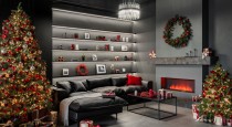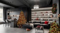 — гостиная зона со стильным черным кожаным диваном, пышной елкой , журнальным столиком, камином и настенными полками с LED-подсветкой;