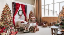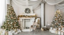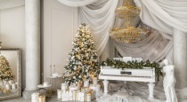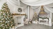 — зона с пышной елкой и новогодними подарками на фоне воздушной ткани и гирлянд;