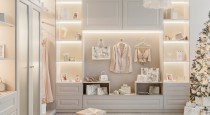 — локация с белым шкафчиком, украшенным в новогоднем оформлении, большой елкой и детскими игрушкам;