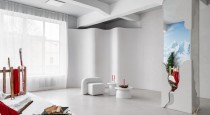 Зал умело поделен на две зоны: бежевую и белую. В бежевой зоне минимум предметов, необычных форм мебель и много воздуха. В белой зоне установлена циклорама.