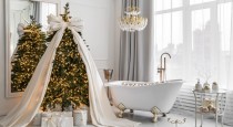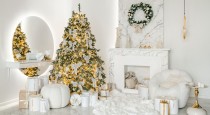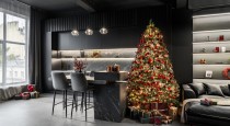 — декоративная стеновая панель под мрамор и пышной елкой;