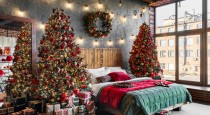 — большая кровать из дерева с пышными елками и подарочными коробками;