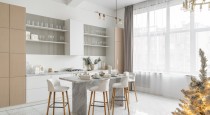 — светлых тонов кухня со столешницей под мрамор и новогодним декором (ВНИМАНИЕ! Кухня нерабочая);