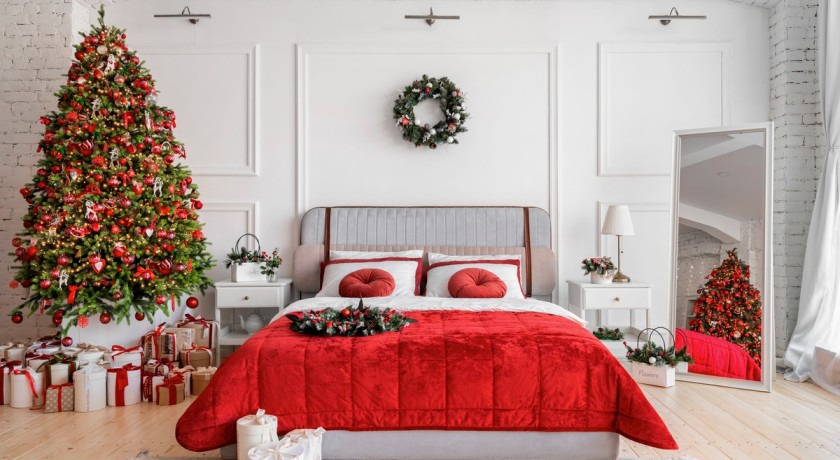 Shanti — настоящее воплощение уюта и гармонии. Он разделен на две зоны, каждая из которых наполнена уютом и атмосферой праздника. Первая зона — двуспальная кровать на подиуме с необычной формой зеркалом и туалетным столиком с новогодними декорациями, вторая — пышная елка с бежевым угловым диваном и по-новогоднему украшенным камином.