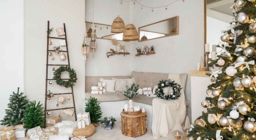 — зона с диваном и креслами в молочных оттенках и пышной елкой;