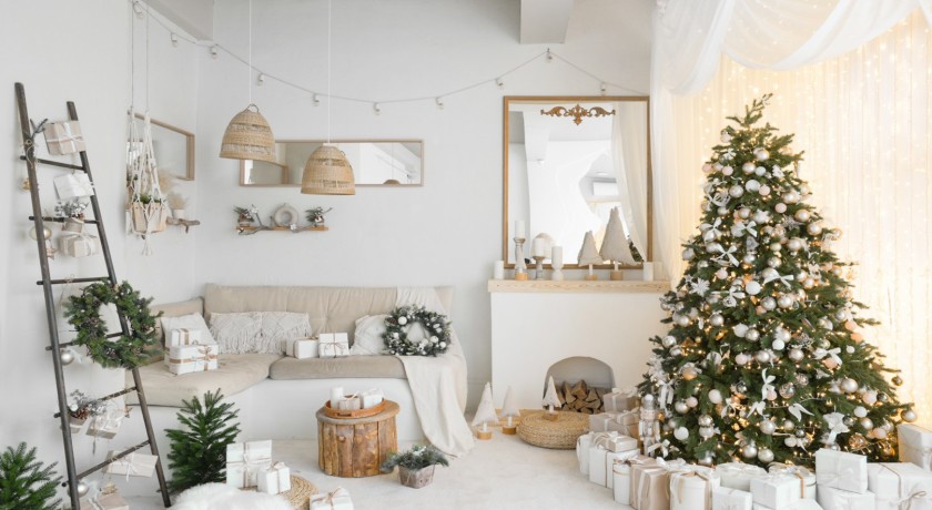 — светлая кухня в стиле прованса с новогодними декорациями;