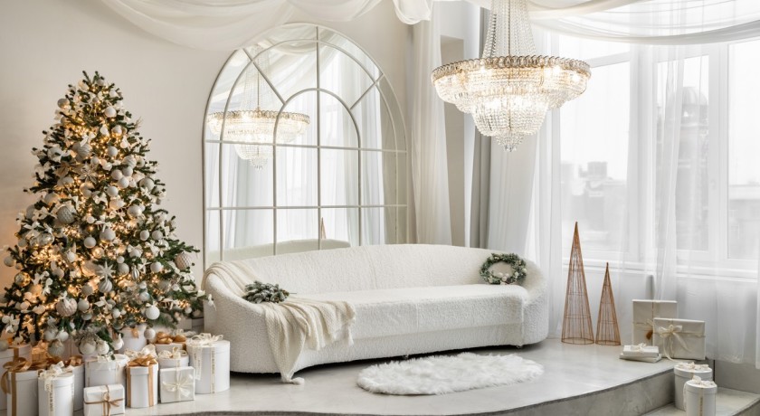 — белый диван с новогодней елью и праздничным декором, установленный на подиуме с зеркальной имитацией окна;