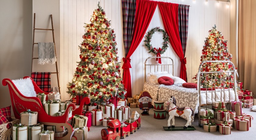 — большая кровать из дерева с пышными елками и подарочными коробками;