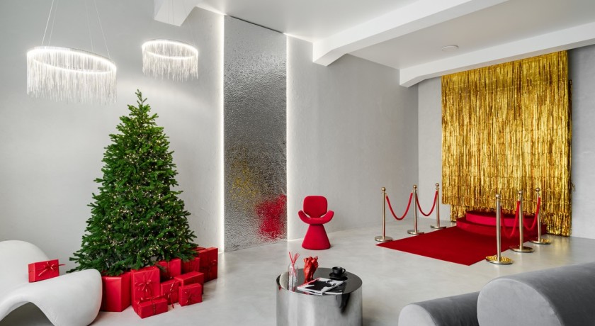Зал представляет собой светлое пространство в спокойной цветовой гамме, оформленное для новогодних фотосессий. Ключевой элемент декора — яркие красные акценты, создающие праздничную атмосферу.