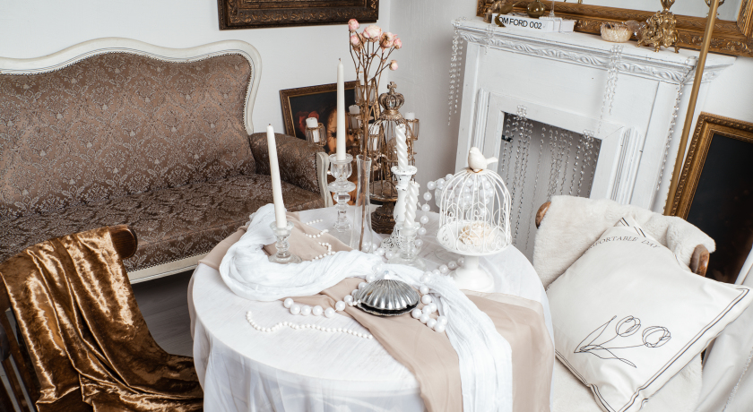 Интерьер: Белые фактурные стены,старинный диван с белой тканью,зеркала в багетной раме,столик на двоих с венскими стульями.Сухоцветы. Черное кресло сетка с черным зеркалом в металлической раме,черный металлический столик,2 пальмы.