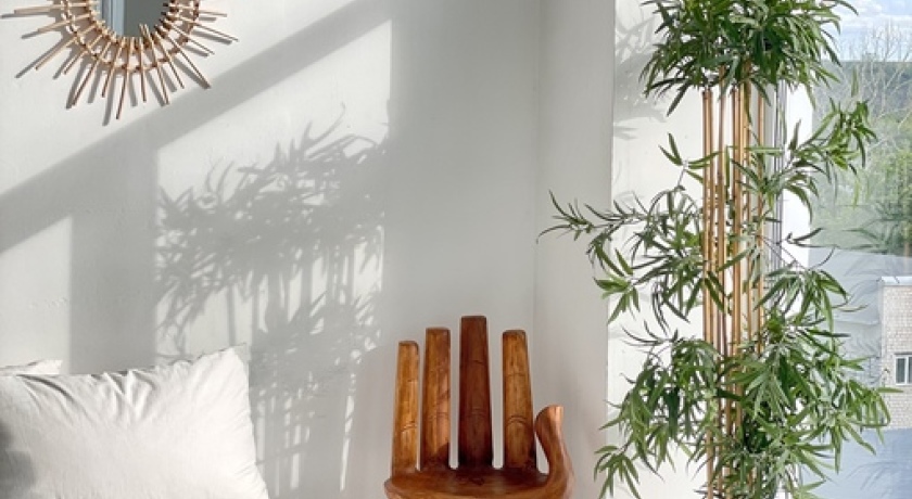 Зал 1 с двумя 3-метровыми панорамными окнами. Белые стены, плетеная мебель и кровать. Прямые солнечные лучи с обеда до заката. В зале есть подвесная система с бумажными фонами. По предварительному запросу - возможна установка дополнительной мебели: письменный стол, обеденный столик, раскладная кушетка для массажа и процедур для съемки профессионального контента.